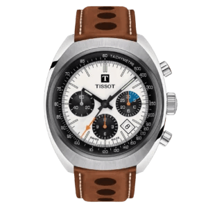 Tissot honours its historic links to motor racing with a re-issue of a seventies-style chronograph, as innovators by tradition. The Tissot Heritage 1973 is pleased to be a part of Tissot’s illustrious stable. It represents the collaboration between Tissot and the Kessel Classics racing team. This 43 mm wide chronograph, with a white dial and matte black counters, meets modern and classic. The overstitched brown calfskin strap, with its huge perforations, is a replica of the one Tissot designed and patented in the 1960s. Tissot has equipped this racing machine with the Valjoux A05.H31 self-winding movement, which is a durable, powerful, and well-tested engine.