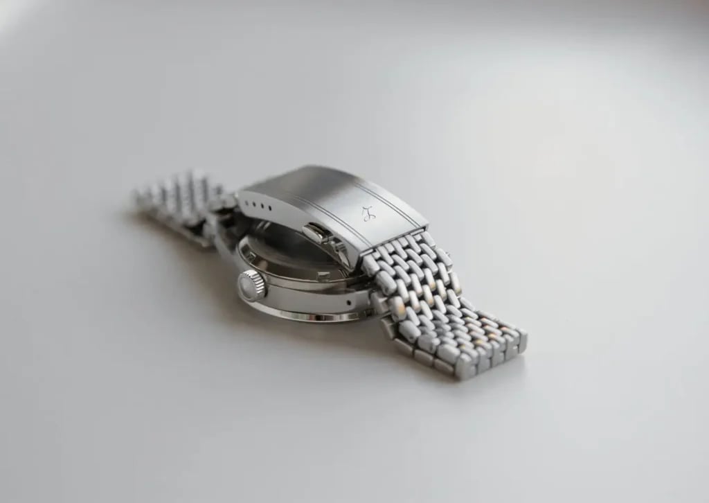 The default stainless steel bracelet has a retro feel to it due to the smaller links. In my opinion, this bracelet design makes this watch too retro, and it feels like a forced vintage look. We’re talking about a modern GMT watch inspired by vintage design elements, and I’d prefer a modern strap or bracelet on it to play with the suspense between vintage and modern.