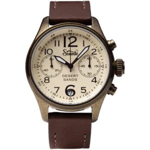 The Desert Sands is quartz powered chronograph with large Arabic numerals. The two subdials are positioned across the horizontal axis, which is counterbalanced by the larger 6 and 12 numerals across the vertical axis. The diameter of the case is 41 mm, therefore it’s a comfortable size for smaller wrists as well.