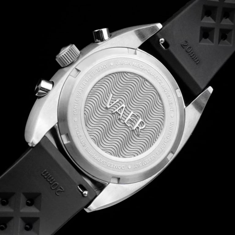 The VAER R1 is equipped with the Seiko VK-63 Meca-Quartz movement. This watch utilizes quartz technology for its primary functions, with a mechanical module specifically for operating the chronograph. This combination allows for a seamlessly sweeping hand, mechanical pushers, and an immediate snap back when resetting.