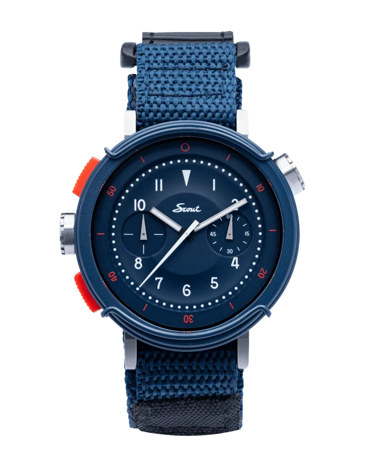 The Moonstone Blue Workhorse is inspired by Scout’s 1960s Moonstone Blue paint, giving the watch a deep navy blue case and dial paired with a matching woven strap for a cohesive, utilitarian look. This uniform navy tone is broken up with a few high-visibility accents: the chronograph pushers on the left side are a bright red-orange, and the inner bezel features subtle red markings at intervals – details reminiscent of vintage automotive indicator lights.